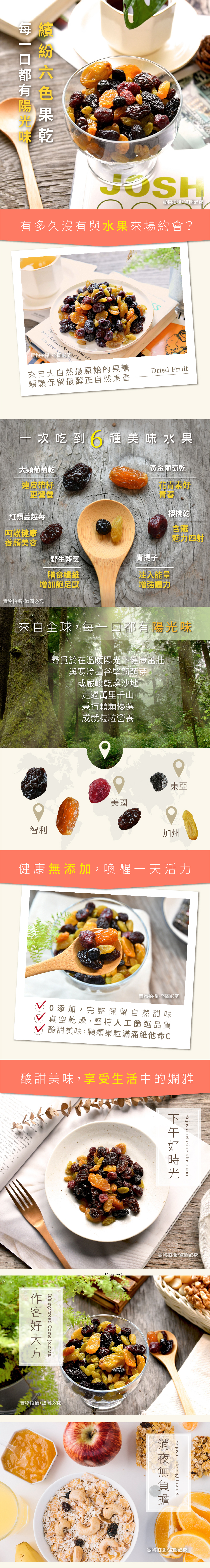 成份:黃金葡萄乾、黑葡萄乾、青提子、蔓越莓、藍莓、櫻桃乾