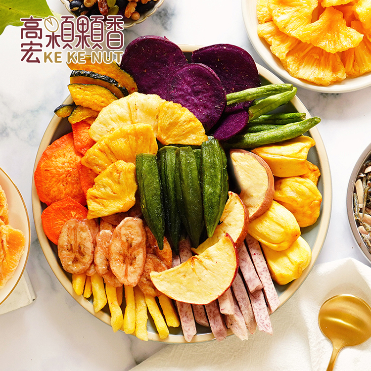 (甘藷、芋頭、蘋果片、紫薯片、鳳梨、波羅蜜、敏豆、黃秋葵、紅蘿蔔、香蕉、當季食蔬)