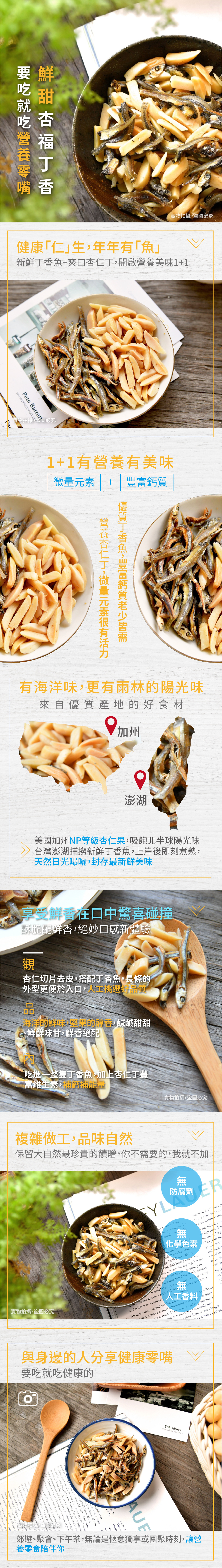 成份:丁香魚、杏仁條、砂糖、食鹽、L-麩酸鈉、L-天門冬酸鈉、5'-次黃嘌呤核苷磷酸二鈉、5'-鳥嘌呤核甘磷酸二鈉、精緻棕櫚油、維他命E(抗氧化劑)