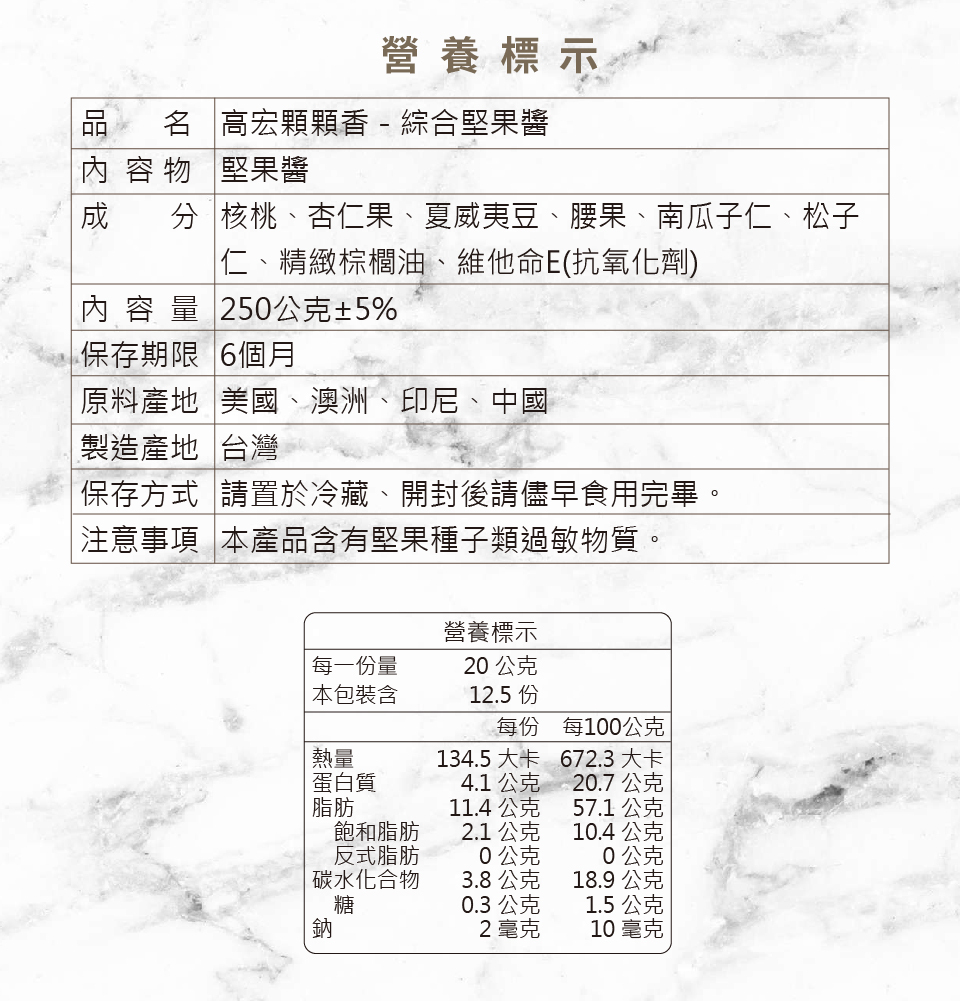 ※營養標示的糖為堅果本身帶有的糖份,製作過程中均無添加糖與水