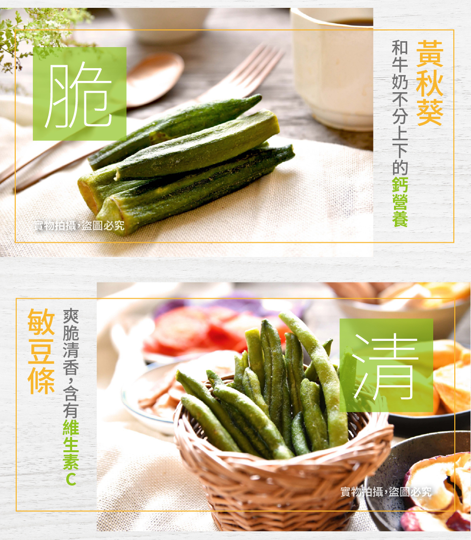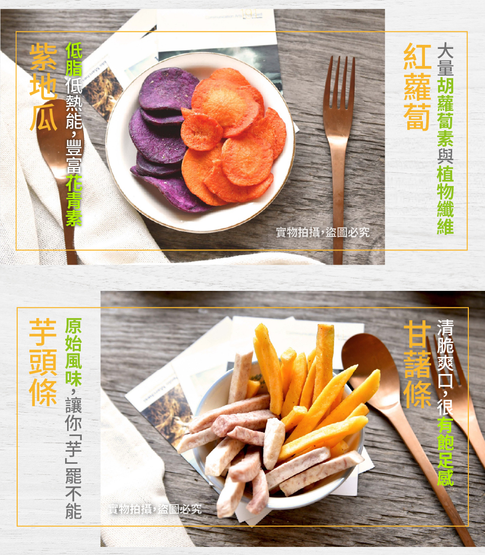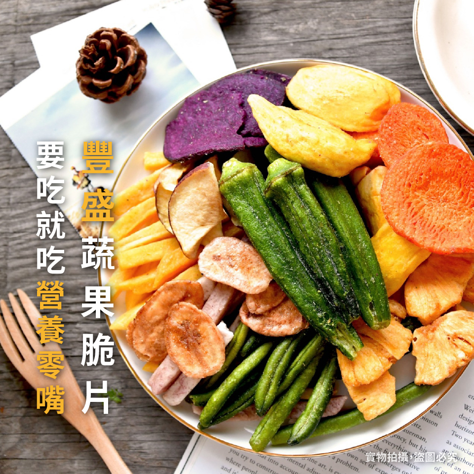 成份:甘藷、芋頭、敏豆、紅蘿蔔、香蕉、波蘿蜜、秋葵、蘋果片、紫薯片、鳳梨、麥芽糖、豆粉、棕櫚油、食鹽、蔗糖麥芽糊精、素肉精粉、酵母抽出物、醬油粉、二氧化矽、DL-胺基丙酸香料
